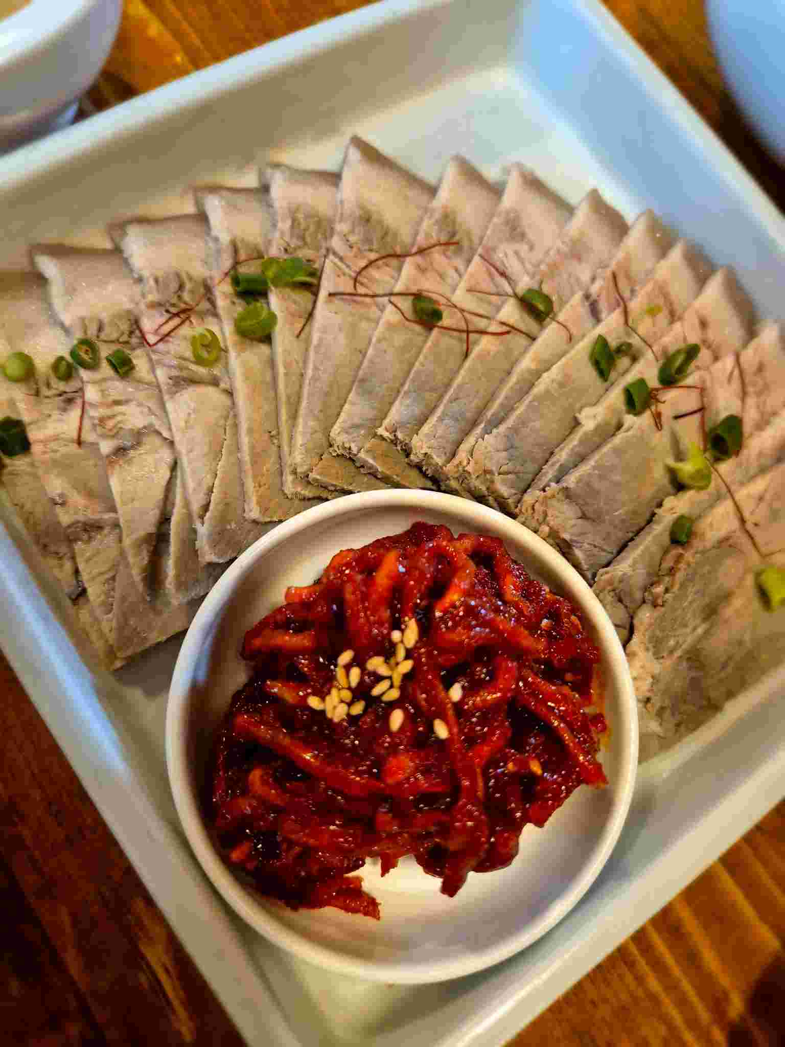 빈대떡 한접시까지 주문해서 둘이 먹기에 양이 좀 많았지만 그래도 처음 방문인지라 다른 메뉴도 맛보고 싶어서 돝제육을 주문하였습니다. 제주산 청정 흑돼지 수육의 담백하고 고소한 씹는 맛이 일품인 차게 먹는 돼지수육이라고 안내되어 있었고 차가운 수육입니다.
