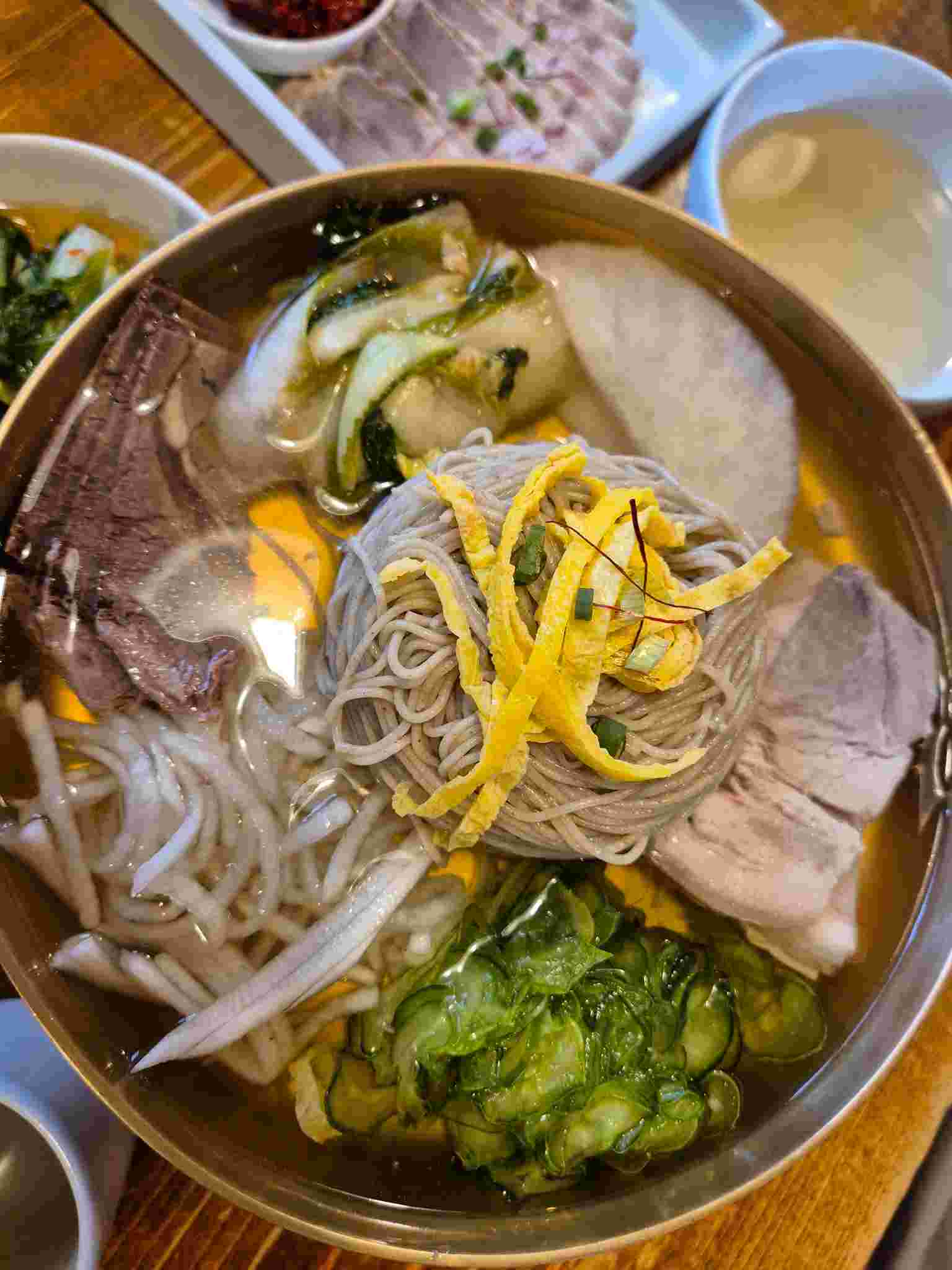저는 평양냉면을 주문하였습니다. 육수는 은은하면서도 깊은 맛을 자랑하며, 메밀면은 100% 제주산을 사용하여 부드럽고 고소한 식감을 제공합니다. 평양냉면을 처음 접하시는 분들도 부담 없이 즐길 수 있는 맛입니다.