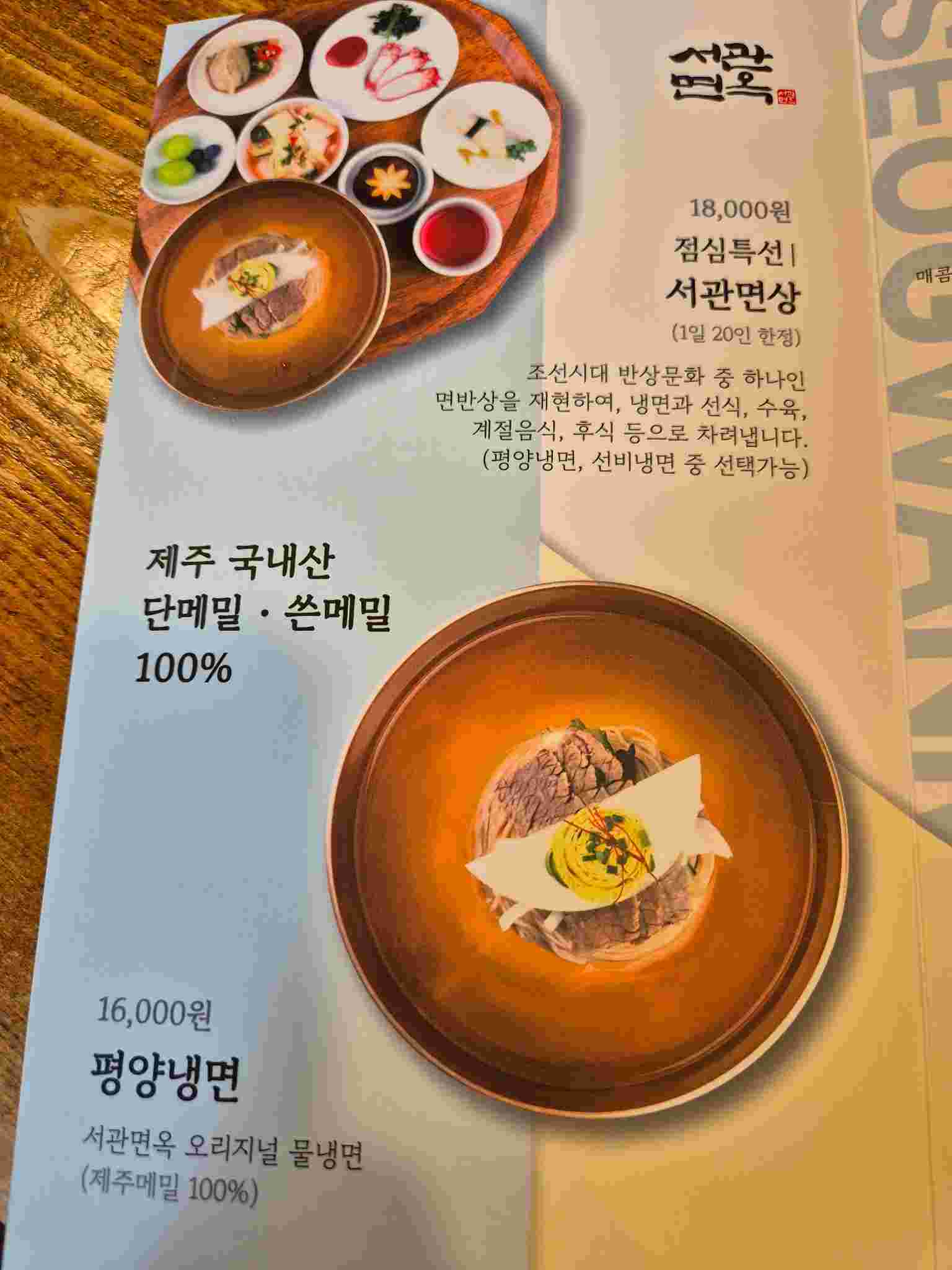 특히 점심시간에만 제공되는 '서관면상'은 냉면과 선식, 수육, 계절음식, 후식까지 포함된 구성으로 가성비가 뛰어나며, 하루 20개 한정으로 제공되니 일찍 방문하시는 것을 추천드립니다. 저는 평일 오전 11시 30분경에 방문했는데 '서관면상'을 주문하니 아쉽게도 이미 20개가 판매 완료되어 주문할 수 없었습니다