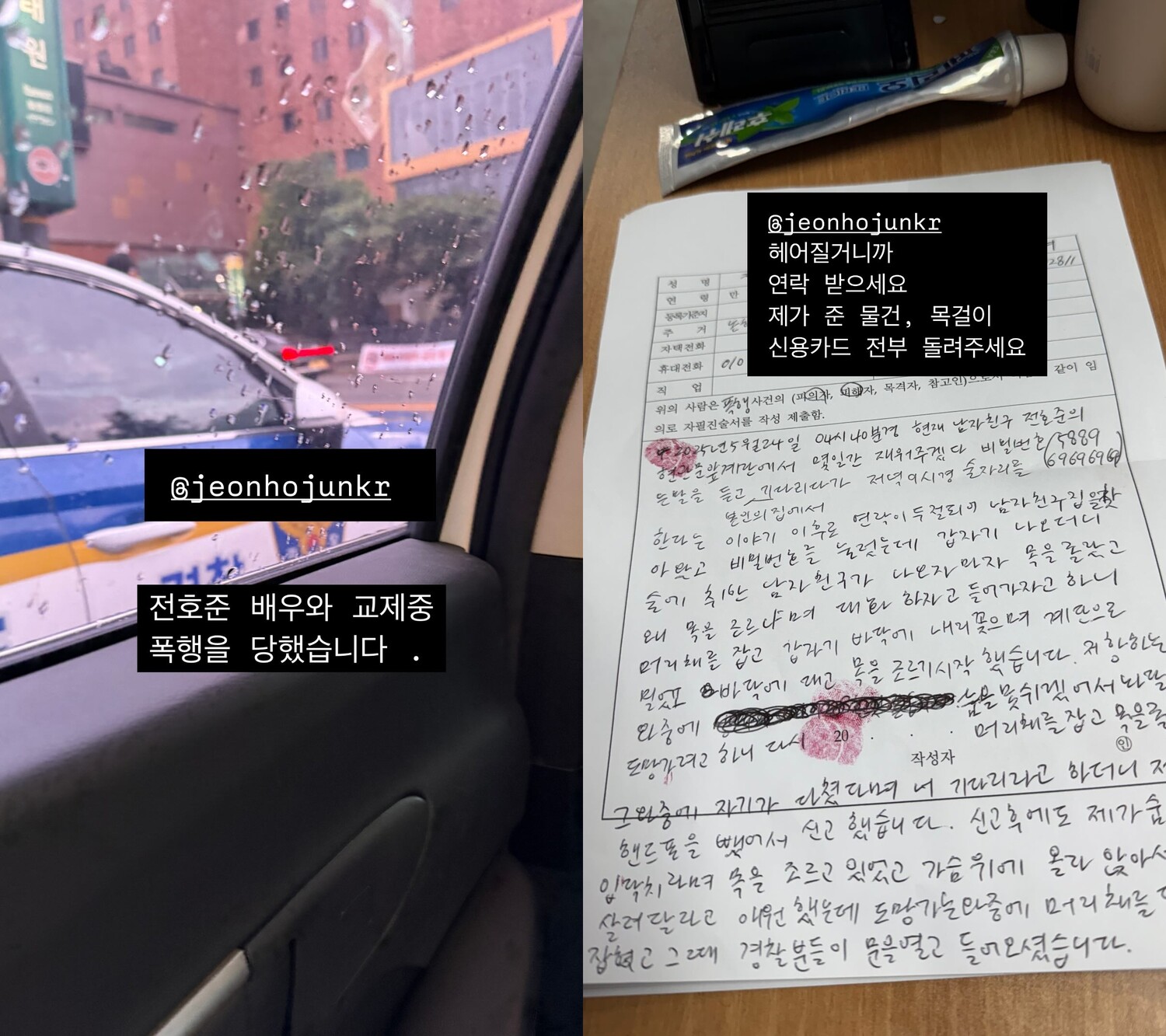 전호준은 다음 날인 25일 자신의 SNS를 통해 긴 입장문과 함께 당시 음성 녹음 파일과 출혈 사진 등을 공개하며 반박에 나섰습니다.