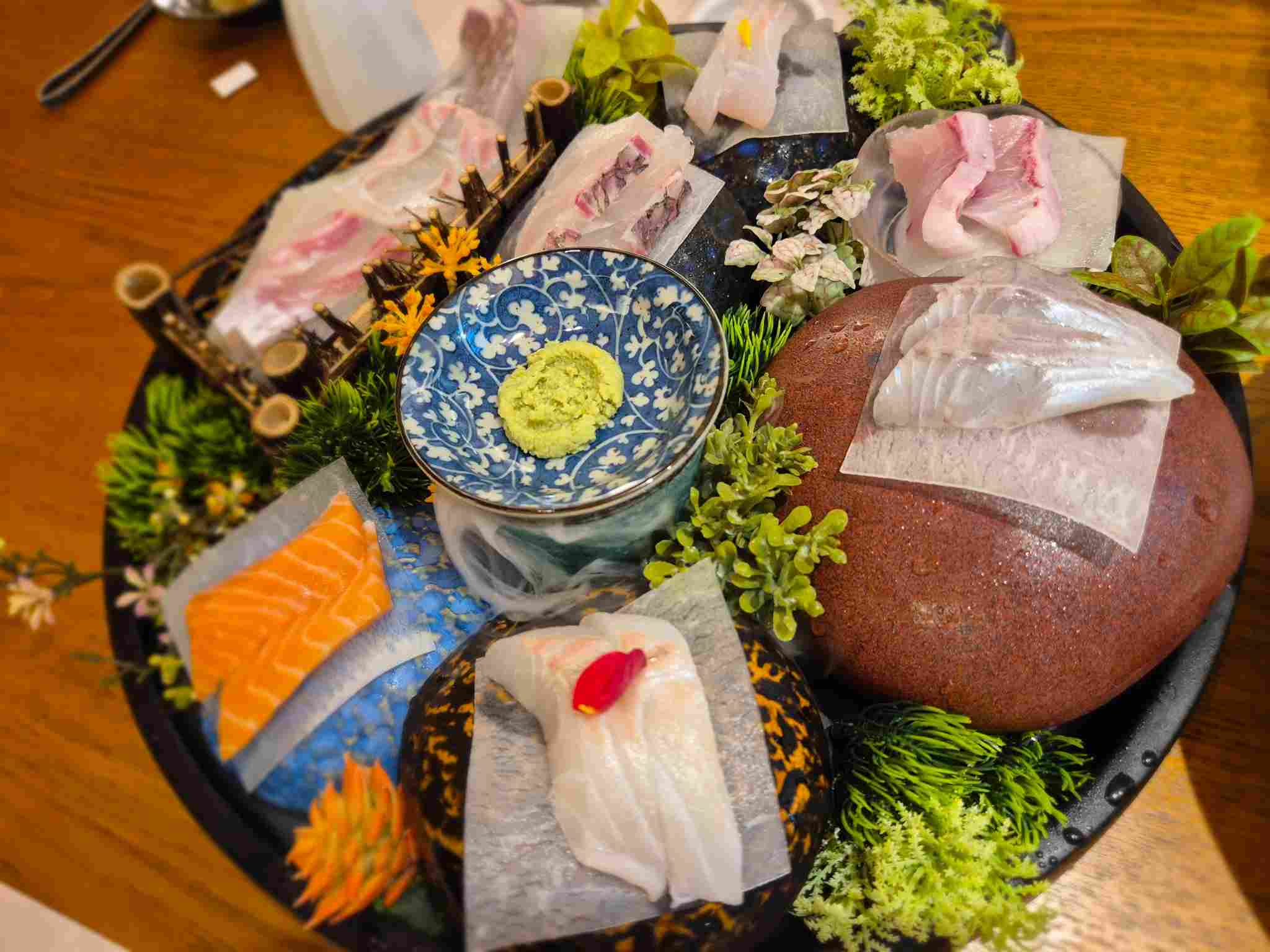 다음으로 메인 음식인 회와 해산물이 제공되었습니다. 플레이팅이 너무 예뻐서 다들 좋아하셨어요.