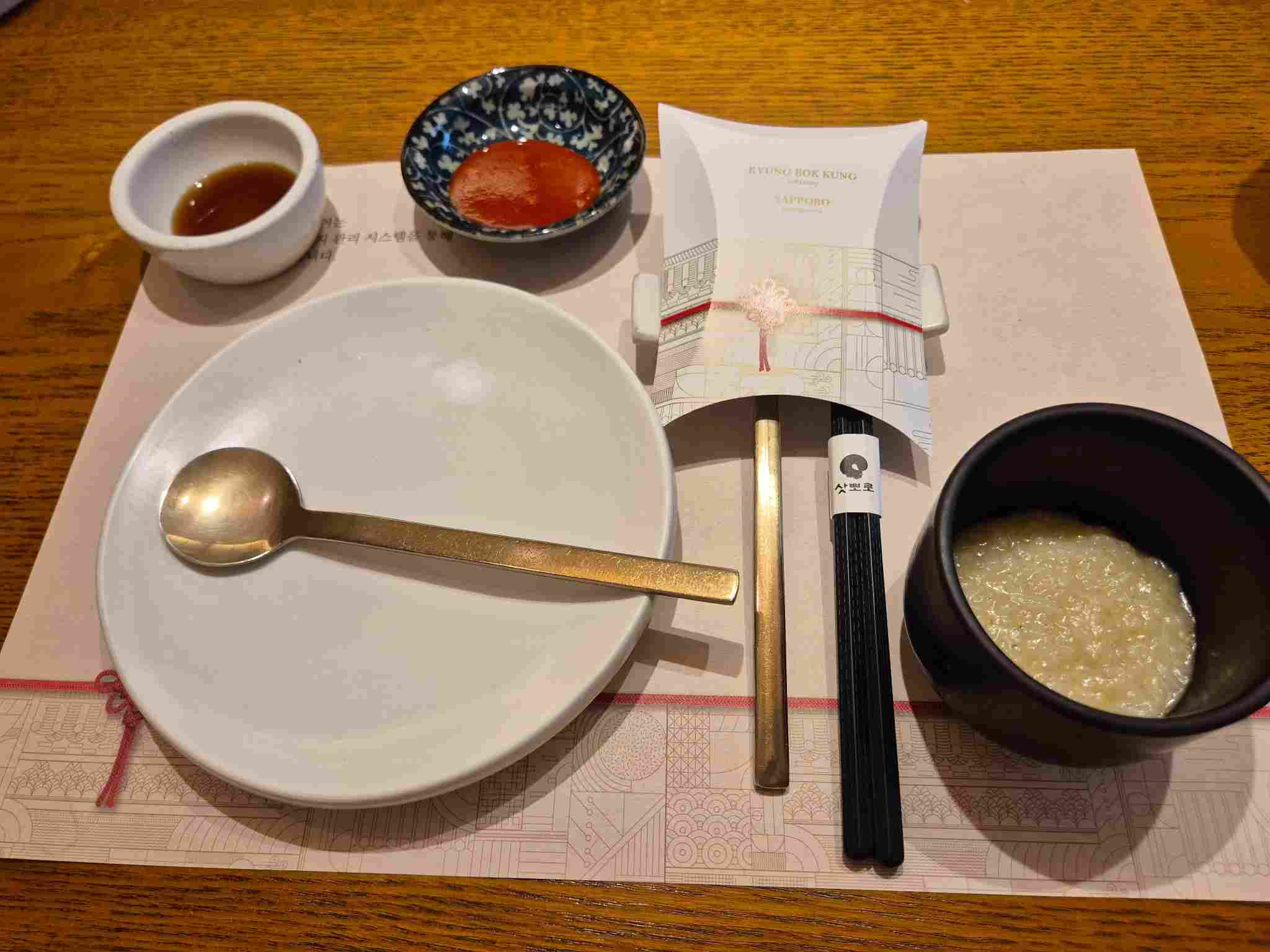 현수막과 세팅된 자리 위로 맨 처음으로 죽과 샐러드가 제공됐습니다.